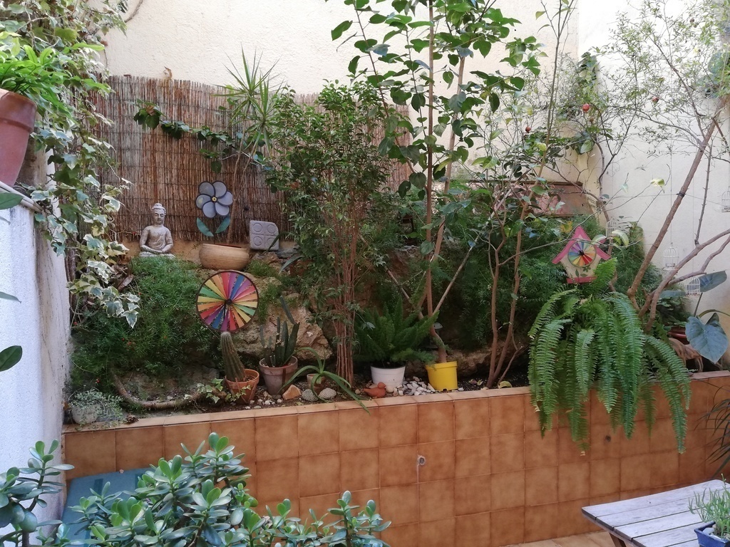 The flat has a small yard with a lot of plants, 2 bedrooms (one with bunk beds and another with a double bed), a small office, one bathroom and a well equipped kitchen.